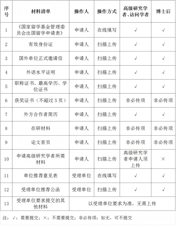 请按以上表格准备申请材料,并按国家公派留学管理信息平台上的说明将相关材料扫描上传至信息平台(《单位推荐意见表》无需扫描上传)。如提供的材料中有英语以外语种书写的,需另提供中文翻译件。受理单位无需向国家留学基金委提交纸质材料,申请人是否需要提交书面申请材料,以受理单位要求为准。