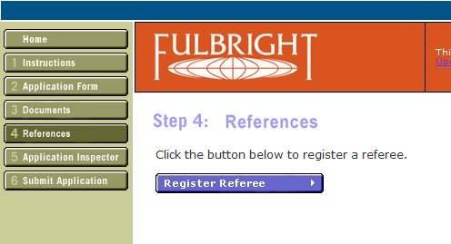 提交短文后,请点击如图所示按钮4 references,注册三名推荐人的信息。注册成功后您的推荐人将自动收到一个登陆富布赖特网上申请系统的邮件和密码,您的推荐人就可开始在网上为您填写推荐信(回答六个问题)。