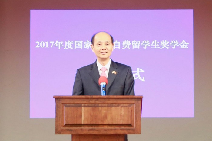 罗总领事在致词中简要介绍了“国家优秀自费留学生奖学金”项目以及领区2017年获奖情况,对获奖学生及其家人、亲友和导师表示祝贺,对协助进行预审的评审专家表示感谢。