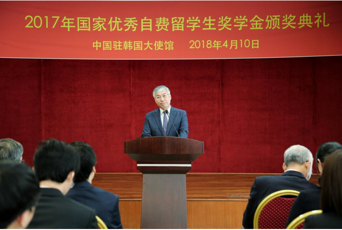 2018年4月10日上午,“2017年国家优秀自费留学生奖学金颁奖典礼”在中国驻韩国大使馆举行。驻韩大使邱国洪、教育参赞艾宏歌、一等秘书于永泉、一等秘书辛立军,19名获奖者以及部分获奖者导师和全韩中国学人学者联谊会代表出席了本次颁奖典礼。