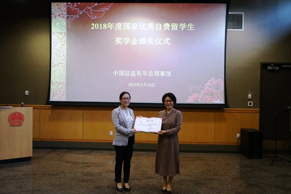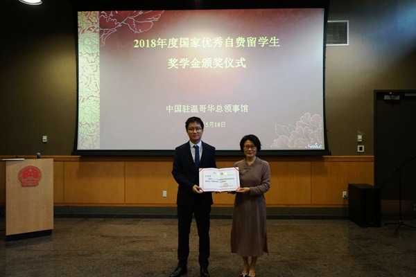 “国家优秀自费留学生奖学金”是中国政府于2003年设立,旨在奖励优秀自费留学人员在学业上取得优异成绩,鼓励他们回国工作或以多种形式为国服务,每年评选一次,至今已有6415名留学生获奖。2018年度全球共有500名留学生获奖,驻温哥华总领馆领区共有16人获奖。