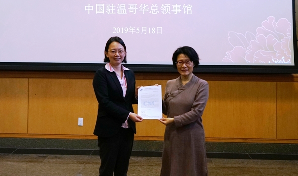 5月18日,驻温哥华总领事佟晓玲出席2018年度“国家优秀自费留学生奖学金”颁奖仪式。来自不列颠哥伦比亚大学、西蒙菲莎大学、维多利亚大学的6位获奖者及家属、导师代表、评审专家代表等20余人参加。颁奖仪式由教育参赞郭军主持。